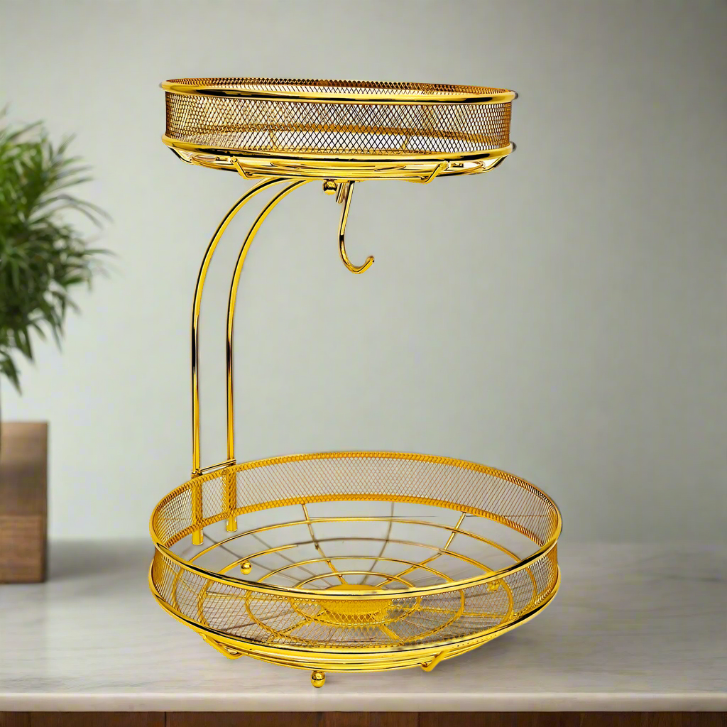 2 Tier Metal Fruit Basket, Multifunctional Storage Basket with Banana Hanger DL6838