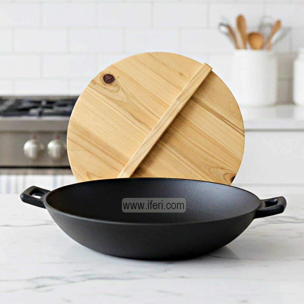30cm Premium Quality Cast Iron Shallow Cookware / Karai with Wooden Lid ALM6952 Size: 30cmMaterial:...