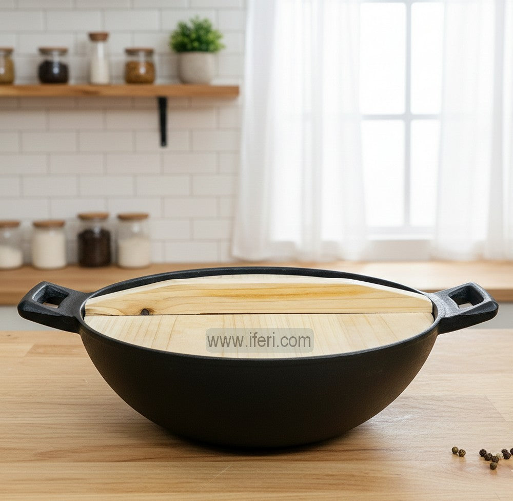 28cm Premium Quality Cast Iron Shallow Cookware / Karai with Wooden Lid ALM6952 Size: 28cmMaterial:...
