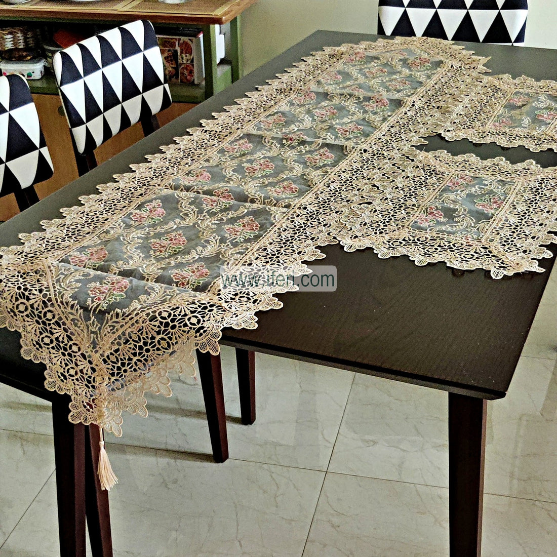 7 Pcs Luxury Embroidered Lace Runner & Placemat RJ15003 • Material: Tissue• Non-washable• Runner Size:...