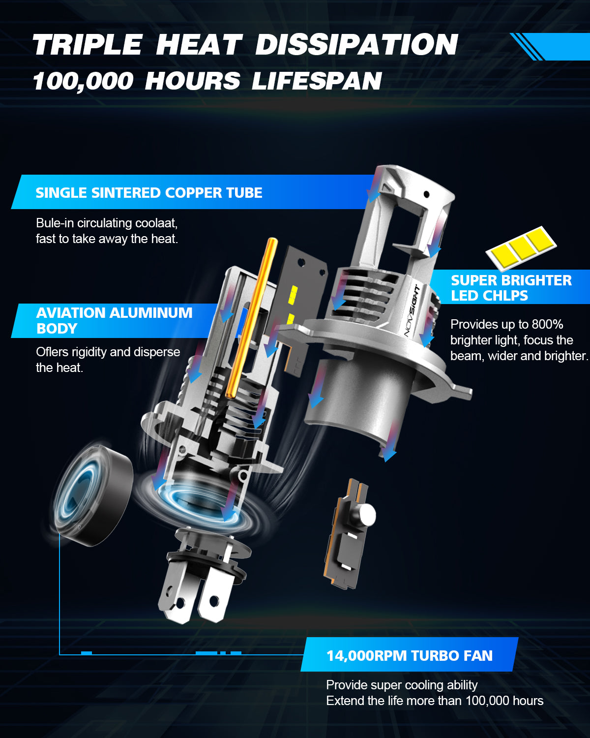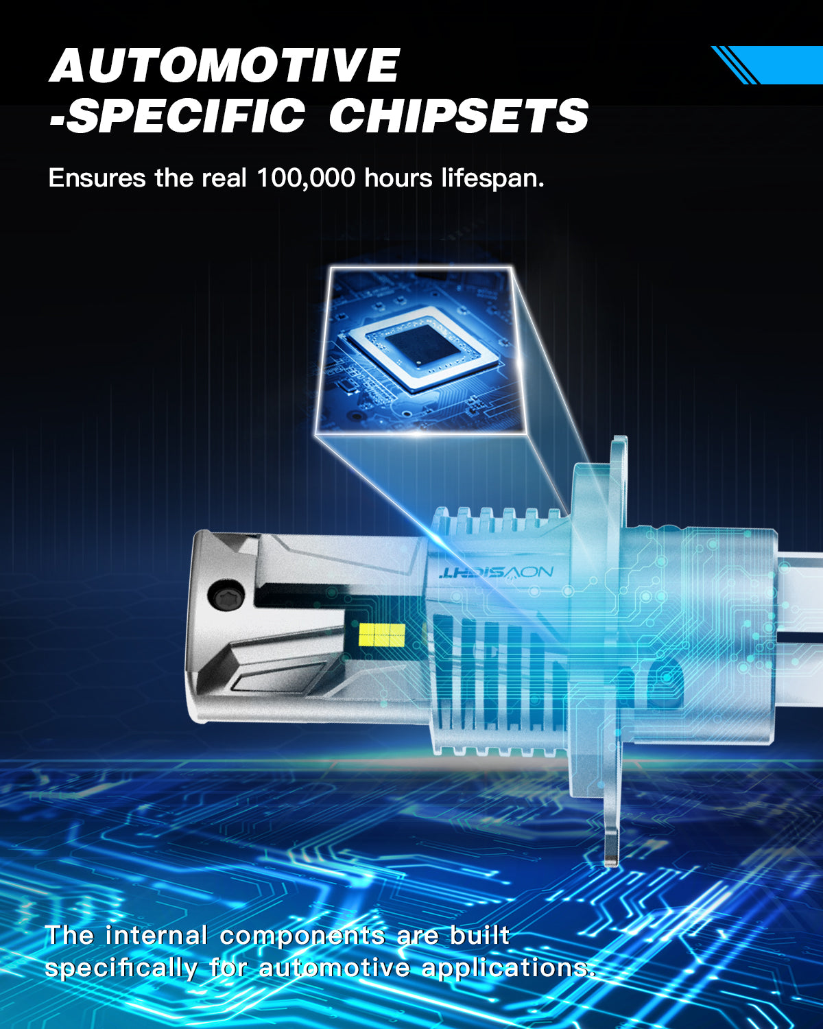 - NOVSIGHT chipsets designed only for automotive use, ensure the real 100,000 hours lifespan because vehicles provide a harsh and demanding operating environment. Meanwhile, other brands may use off-the-shelf chipsets, which will create extreme heat and decreases lifespan.